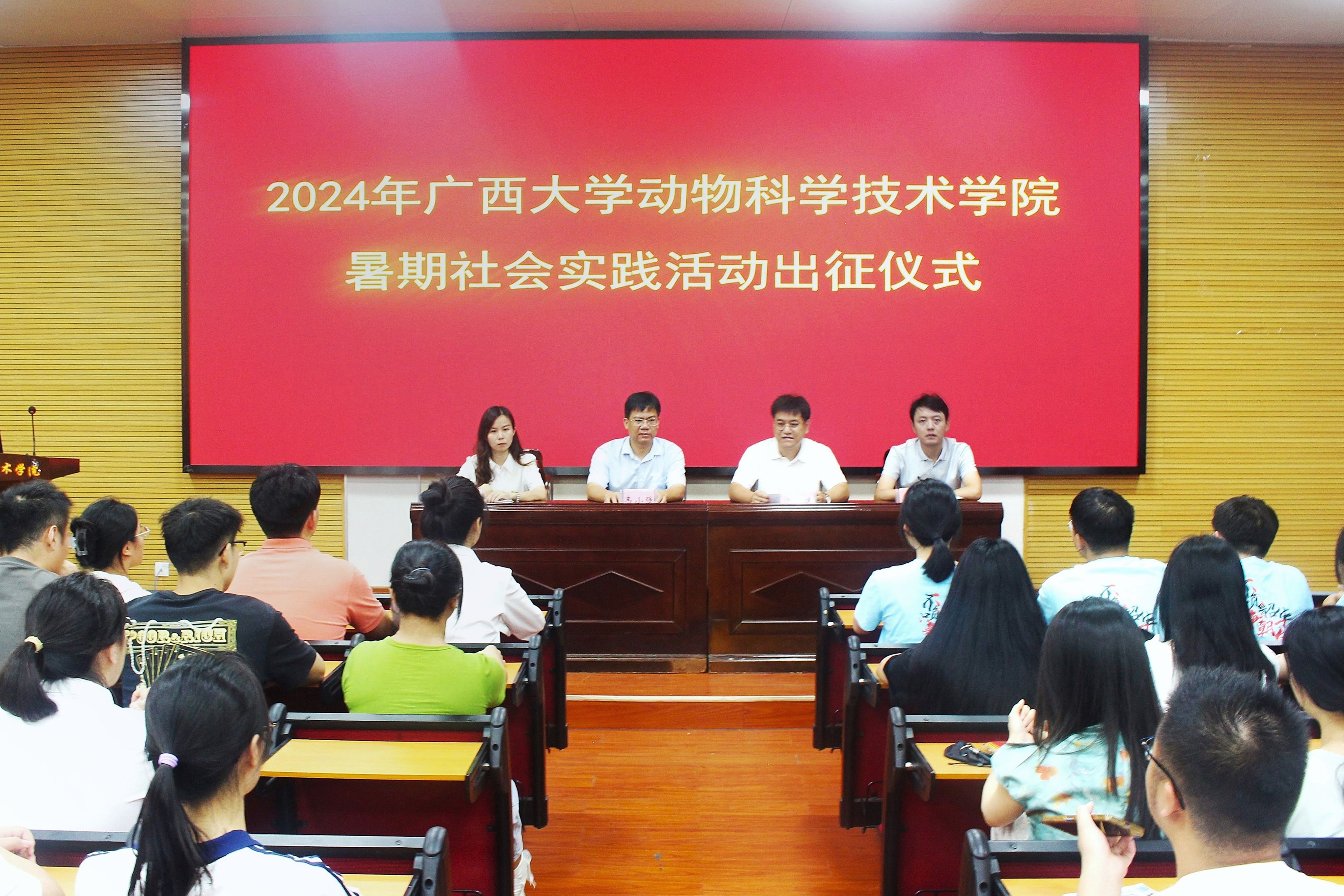 In order to deeply study Xi Jinping Thought on Socialism with Chinese Characteristics for a New Era, implement the important requirements of General Secretary Xi Jinping's exposition on Guangxi's work, and guide and help young students to receive education, grow their talents, and make contributions in social practice, the College of Animal Science and Technology of Guangxi University held a departure ceremony for the 2024 summer social practice activities in Lecture Hall 318 on the afternoon of July 13. Wei Xiaoqiang, Secretary of the Party Committee of the College of Animal Science and Technology, Sha Jian, Deputy Secretary of the Party Committee, Li Lina, Secretary of the Youth League Committee, Liu Cheng, Deputy Secretary of the Youth League Committee, as well as instructors and key members of various social practice teams attended the ceremony.